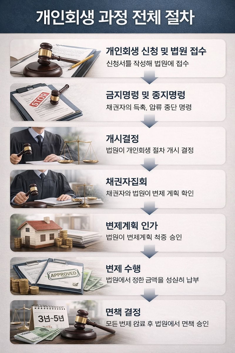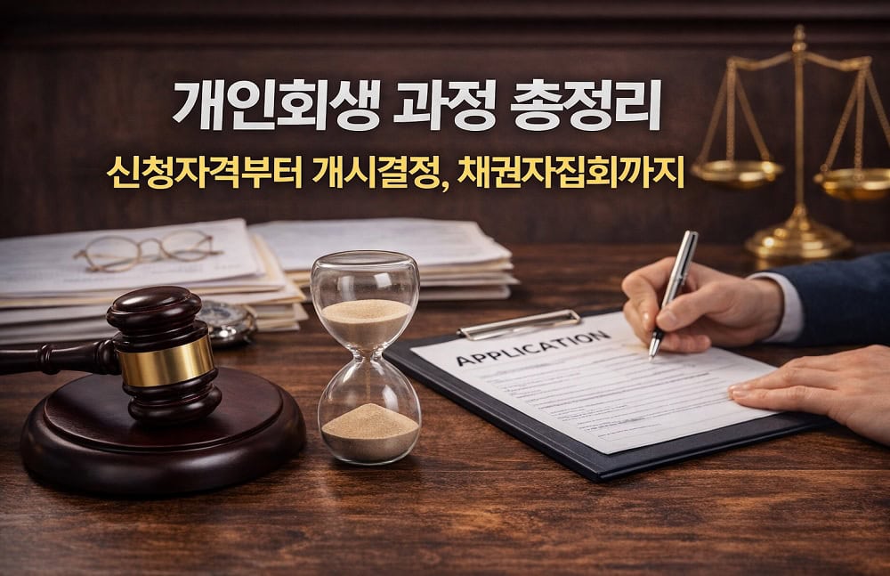 개인회생 신청자격부터 신청 방법, 개시결정 기간, 채권자집회 절차까지 개인회생 과정을 한눈에 정리했습니다. 개인회생 신청 전 알아야 할 조건, 진행 절차, 변제 방식과 주의사항까지 쉽게 이해할 수 있도록 정리한 개인회생 가이드입니다.