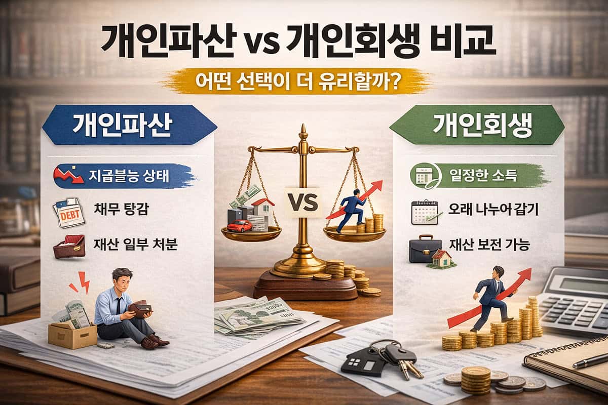 개인파산 자격을 알아보는 과정에서 가장 많이 비교되는 것이 바로 개인회생입니다. 두 제도 모두 채무 문제를 해결하기 위한 방법이지만 적용 기준과 결과가 다르기 때문에 자신의 상황에 맞는 선택이 중요합니다. 특히 개인파산 조건과 개인회생 조건은 명확한 차이가 있기 때문에 단순히 “어떤 게 더 좋다”가 아니라 현재 상황에 따라 판단해야 합니다.